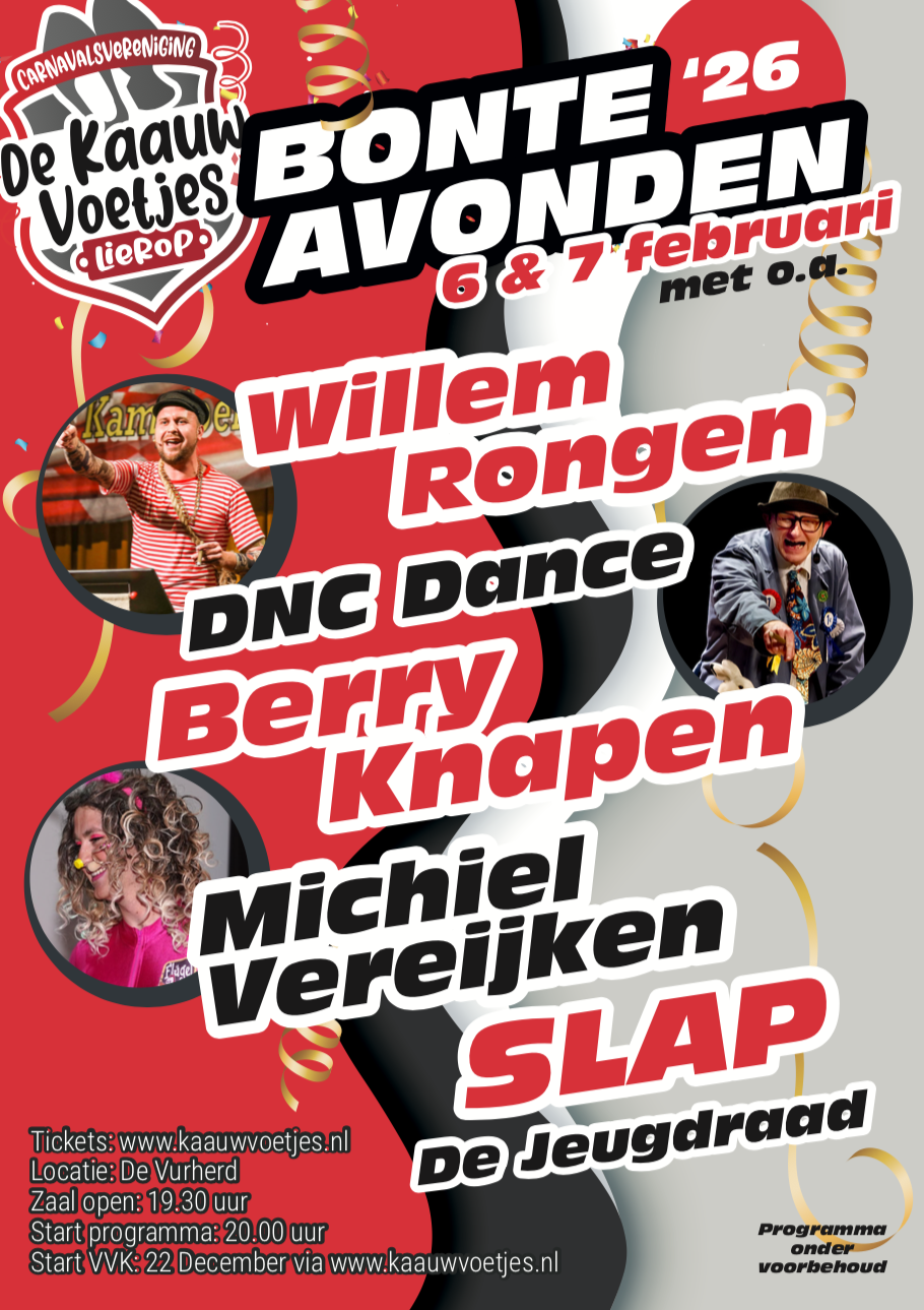 De Bonte Avonden staan al weer voor de deur. Met een supermooi programma zal het weekend in het teken staan van lol en het warm maken voor de aanstaande carnaval. Iedereen is er dan ook meer dan klaar voor en zal ook dit plaatsvinden in de Vurherd op 6 & 7 februari!