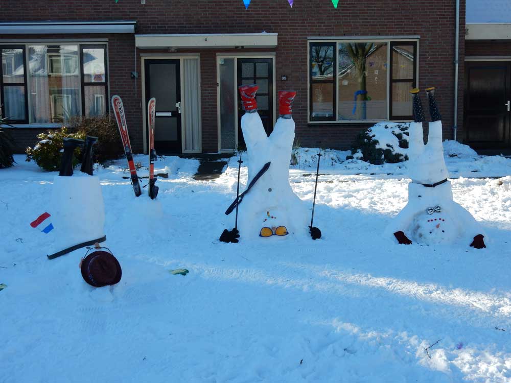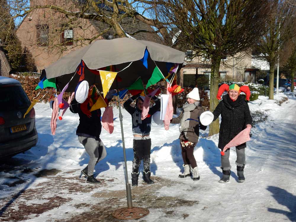 Het thema in de Renkant was: “we maken het niet te bont”! Hier kwamen we mondkapjes als versiering tegen op ramen, op sneeuwpoppen en op ballonnen. De familie sneeuwpop was ook erg goed bedacht. En wat fijn om te zien dat de ijsmeesters uit deze buurt, ondanks hun vele werk voor de ijsbaan op het Gildeplein, toch nog wat tijd hebben gevonden om aan carnaval te denken.