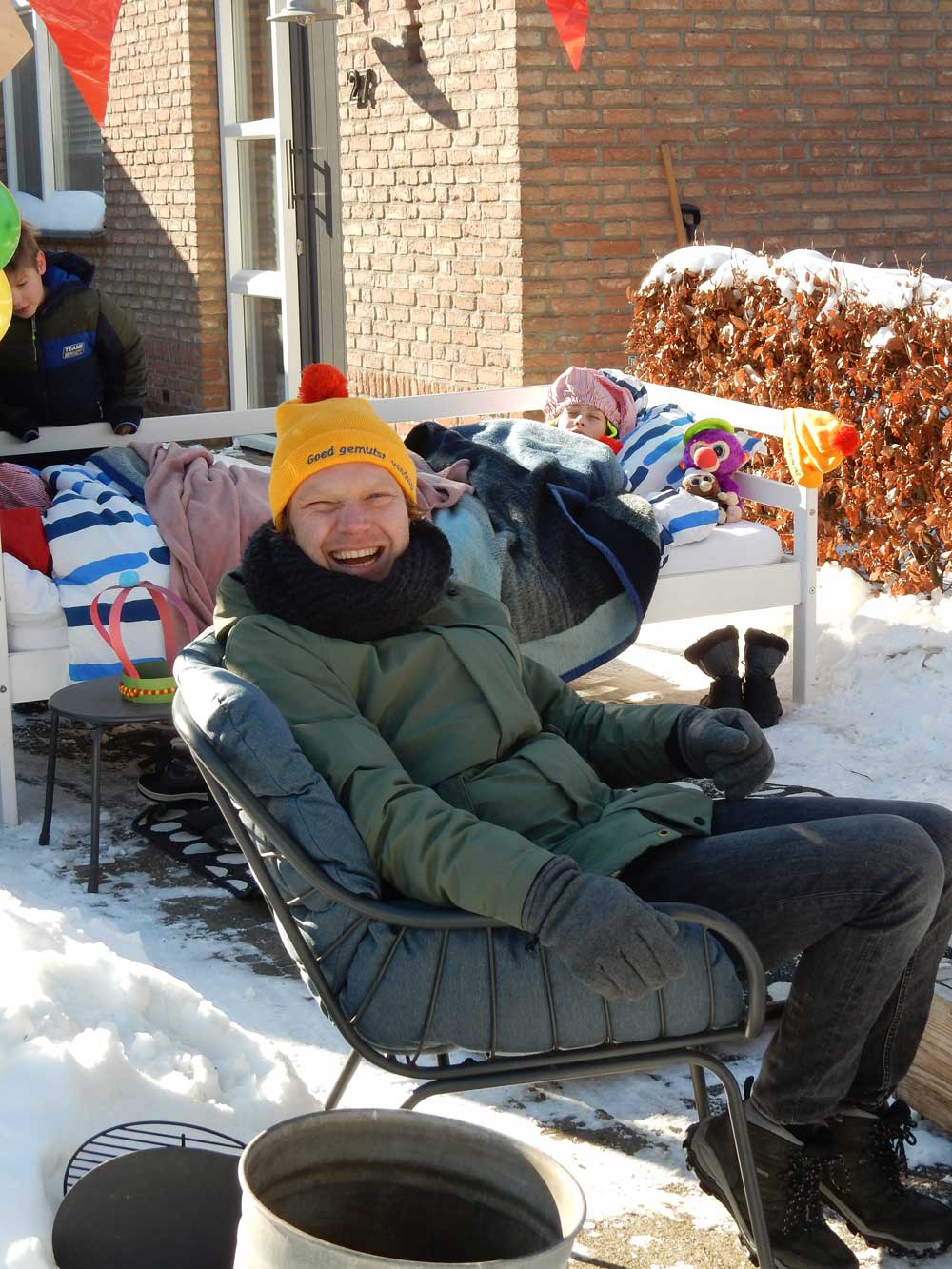 Complimenten voor de originaliteit qua corana-proof-uitvoering! Er zaten twee thee-mutsen klaar, iets verderop stonden de koksmutsen en weer verder stond er een feestmuts in de tuin uitbundig te dansen. Vervolgens van de mutsverkoop door naar de slaapmutsen, de badmutsen en de vergeetmutsen! Ook op je eigen oprit kun je best met je gezin een feestje bouwen!